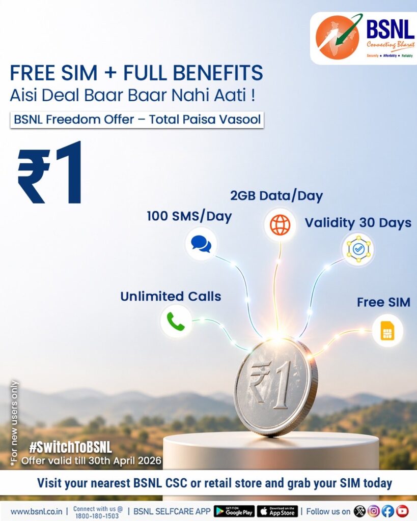 বর্তমানে মোবাইলের রিচার্জের খরচ সাধারণ মানুষের নাগালের বাইরে চলে যাচ্ছে। যখন বেসরকারি কোম্পানিগুলো একের পর এক রিচার্জের দাম বাড়াচ্ছে, ঠিক তখনই সাধারণ মানুষের মুখে হাসি ফোটাল বিএসএনএল। সরকারি এই কোম্পানি নিয়ে এসেছে এক চমৎকার অফার, যেখানে মাত্র ১ টাকা খরচ করেই পেতে পারেন অনেক সুবিধা। বিএসএনএল-এর এই নতুন ‘ফ্রিডম অফার’ এখন সব মহলে চর্চার বিষয় হয়ে দাঁড়িয়েছে।