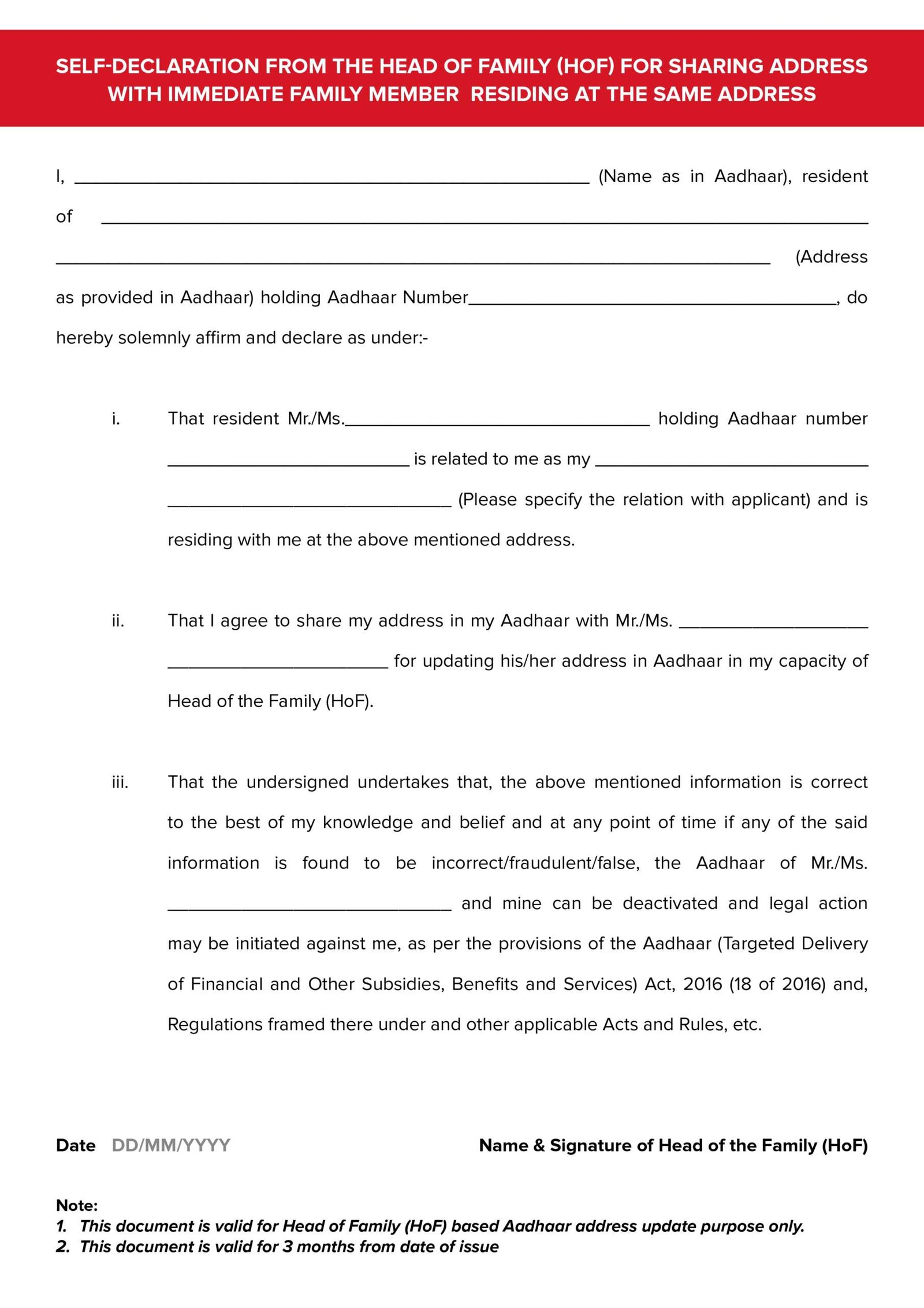 Aadhar Card Head Of Family (HoF) Application Form Pdf / Aadhaar Card ‘Head of Family’ based online address update Form : Download