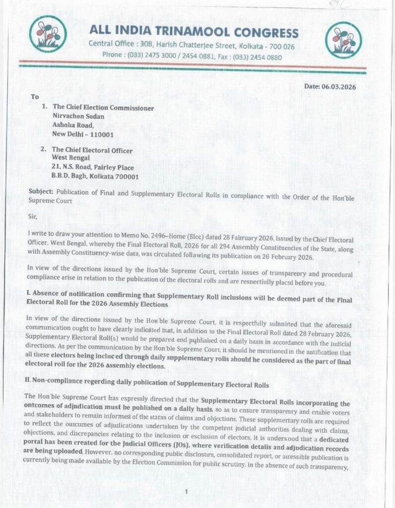 ২০২৬ এর বিধানসভা নির্বাচনের আগে ভোটার তালিকার স্পেশাল ইনটেনসিভ রিভিশন (SIR) নিয়ে রাজ্য রাজনীতি একেবারে ফুঁসছে।  শুক্রবার (৬ মার্চ) দুপুর থেকে কলকাতার এসপ্ল্যানেড মেট্রো চ্যানেলে (ধর্মতলা) অনির্দিষ্টকালের ধর্নায় বসেছেন মুখ্যমন্ত্রী মমতা বন্দ্যোপাধ্যায়।  একই দিনে তৃণমূলের সর্বভারতীয় সাধারণ সম্পাদক অভিষেক বন্দ্যোপাধ্যায় প্রধান নির্বাচন কমিশনার জ্ঞানেশ কুমার ও রাজ্যের মুখ্য নির্বাচনী আধিকারিক মনোজ আগরওয়ালকে চিঠি লিখে সুপ্রিম কোর্টের নির্দেশ অমান্যের গুরুতর অভিযোগ তুলেছেন।