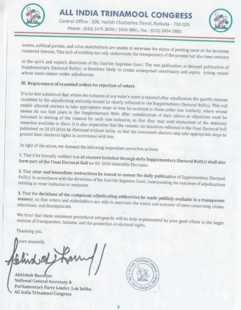 এছাড়াও এদিন জানান, প্রতিদিন সাপ্লিমেন্টারি ভোটার লিস্ট প্রকাশ করা হোক। কারণ হিসেবে বলেন? ২৮ ফেব্রুয়ারি ফাইনাল ভোটার লিস্ট বের হওয়ার পরও অনেকের নাম নিয়ে ‘লজিক্যাল ডিসক্রিপেন্সি’ দেখা গিয়েছে।  সেই সব কেসের বিচার চলছে। সুপ্রিম কোর্টের নির্দেশ অনুযায়ী, যাদের নাম নিয়ে মামলা চলছে তাদের নাম পরে সাপ্লিমেন্টারি লিস্টে যোগ হওয়ার কথা—কিন্তু অভিষেকের অভিযোগ, সেই প্রক্রিয়ায় যথেষ্ট স্বচ্ছতা নেই।  সুপ্রিম কোর্টের নির্দেশ এ বলা হয়েছে প্রতিদিন সাপ্লিমেন্টারি ভোটার লিস্ট প্রকাশ করা হোক, যাতে যাচাইয়ের ফলাফল স্পষ্ট হয় বলে দাবি অভিষেকের।  এছাড়া ‘লজিক্যাল ডিসক্রেপ্যান্সি’ বা অসঙ্গতির কারণে নাম বাদ দেওয়া হলে তার যুক্তিসংগত কারণ জানাতে হবে।