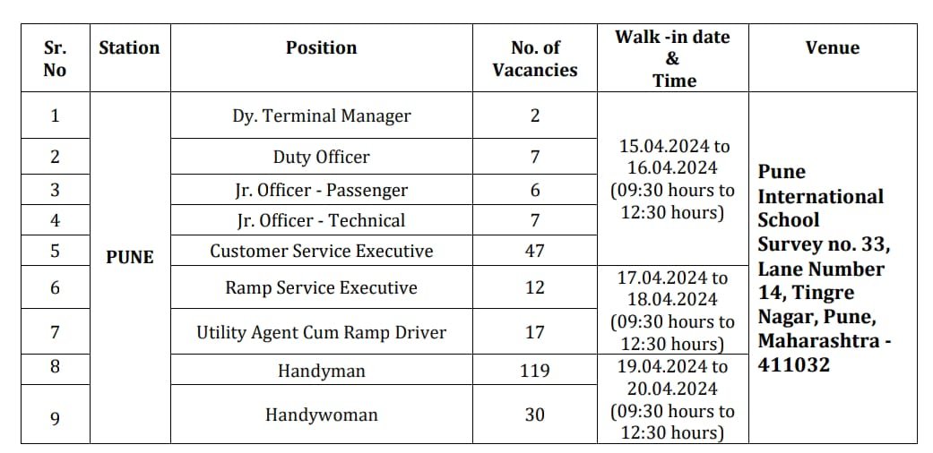 নিয়োগ করা হবে মোট নয়টি পদে, রয়েছে প্রচুর শূন্যপদ। পদগুলি হলো Handywoman, Handyman, Utility Agent Cum Ramp Driver, Ramp Service Executive, Customer Service Executive, Jr.Officer Technical, Jr.Officer Passenger, Duty Officer, Dy. Terminal Manager। নিয়োগ করা হচ্ছে এই সমস্ত পদে মাধ্যমিক, উচ্চ মাধ্যমিক, গ্রাজুয়েট ইত্যাদি বিভিন্ন শিক্ষাগত যোগ্যতায়।