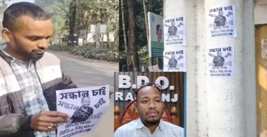 গ্রেপ্তারি পরোয়ানা জারির পর থেকেই উধাও রাজগঞ্জের বিডিও প্রশান্ত বর্মন। এই পরিস্থিতিতে রাজগঞ্জ বিডিও অফিস চত্বরে হঠাৎ দেখা যায় ‘সন্ধান চাই’ লেখা পোস্টার। পোস্টারে রয়েছে অভিযুক্ত পলাতক বিডিওর ছবি ও সন্ধান চাই লেখা। জানা গেছে, এসএফআই রাজগঞ্জ লোকাল কমিটির তরফ থেকে এই পোস্টার লাগানো হয় এ ছাড়া এদিন অফিস চত্বরে সন্ধান চাই লিফলেট বিলি করে এসএফআই কর্মী সমর্থকরা।