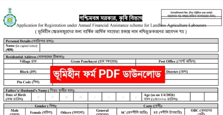 সব খবর মোবাইলে পেতে Whatsapp গ্রুপে জয়েন্ট করুন ভূমিহীন কৃষকদের জন্য বড় সুখবর। চালু হলো মুখ্যমন্ত্রী মমতা বন্দ্যোপাধ্যায়ের উদ্যোগে চালু হওয়া নতুন প্রকল্প ভূমিহীন বার্ষিক আর্থিক সহায়তা প্রকল্প-এর (Bhumihin Krishak Bandhu Form) আবেদন প্রক্রিয়া। যেসব কৃষকের নিজস্ব চাষযোগ্য কৃষিজমি নেই, সেই সকল যোগ্য কৃষকদের এই প্রকল্পের আওতায় এনে বার্ষিক ৪,০০০ টাকা করে আর্থিক সহায়তা প্রদান … Continue reading Bhumihin Krishak Bandhu Form 2026 PDF Download: ভূমিহীন ক্ষেতমজুর বার্ষিক আর্থিক সহায়তা প্রকল্প আবেদন ফর্ম ও কি কি ডকুমেন্টস লাগবে দেখুন!