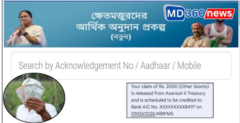ভূমিহীন ক্ষেতমজুর বার্ষিক আর্থিক সহায়তা প্রকল্পের প্রথম কিস্তির ২০০০ টাকা কৃষকদের ব্যাংক অ্যাকাউন্টে পাঠানো শুরু করেছে পশ্চিমবঙ্গ সরকার।  আপনার ব্যাংক অ্যাকাউন্টে টাকা জমা হয়েছে কিনা এবং আপনার আবেদন বর্তমানে কোন পর্যায়ে রয়েছে, তা এখন খুব সহজেই অনলাইনে মোবাইল ফোনের মাধ্যমে চেক করা যাবে।  আজকের প্রতিবেদনে দেখে নিন কিভাবে ঘরে বসেই কয়েকটি সহজ ধাপ অনুসরণ করে নিজের স্ট্যাটাস চেক করবেন।  বিস্তারিত জানতে অবশ্যই আজকের প্রতিবেদনটি সম্পূর্ণ পড়ুন।