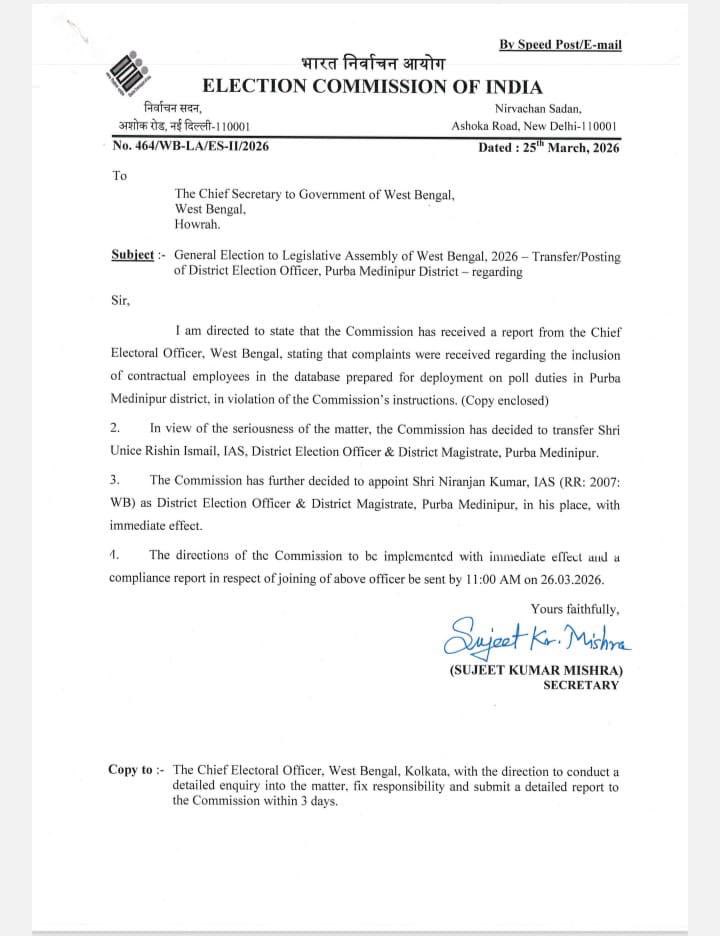 সামনেই ২০২৬ এর বিধানসভা নির্বাচন। আর তার আগেই প্রশাসনিক স্তরে কড়া হস্তক্ষেপ নির্বাচন কমিশনের। বুধবার কমিশনের নির্দেশে পূর্ব মেদিনীপুরের জেলাশাসক ইউনিস ঋষিন ইসমাইলকে তাঁর পদ থেকে সরিয়ে দিয়েছে। নির্বাচন কমিশনের সচিব সুজিত কুমার মিশ্রের সই করা একটি চিঠিতে এই সিদ্ধান্তের কথা জানানো হয়েছে। ভোটের আগে জেলা প্রশাসনের শীর্ষ আধিকারিককে এভাবে হঠাৎ সরিয়ে দেওয়ায় প্রশাসনিক মহলে ব্যাপক চাঞ্চল্য ছড়িয়েছে।