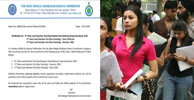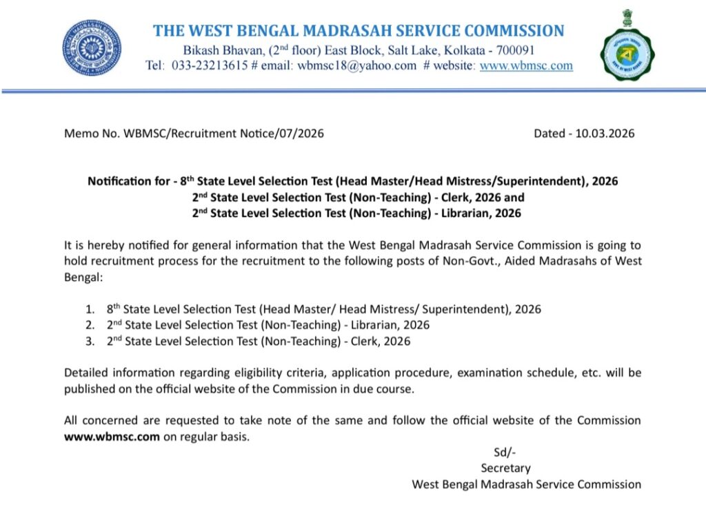 দীর্ঘ প্রতীক্ষার অবসান ঘটিয়ে রাজ্যের সরকারি সাহায্যপ্রাপ্ত মাদ্রাসাগুলোতে নিয়োগের বিজ্ঞপ্তি প্রকাশ করল পশ্চিমবঙ্গ মাদ্রাসা সার্ভিস কমিশন (WBMSC)। মঙ্গলবার প্রকাশিত কমিশনের এক বিজ্ঞপ্তিতে এ কথা জানানো হয়েছে। রাজ্যের মাদ্রাসাগুলোতে প্রধান শিক্ষক, প্রধান শিক্ষিকা, সুপারিনটেনডেন্ট, ক্লার্ক এবং লাইব্রেরিয়ান পদে নিয়োগ প্রক্রিয়া শুরু হতে চলেছে।