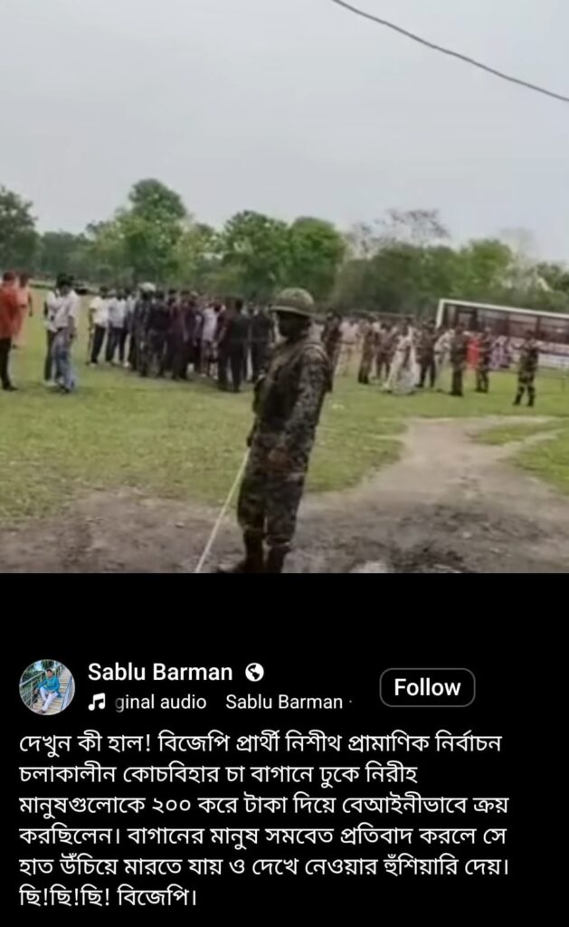 সাবলু বর্মণ তাঁর ফেসবুক পোস্টে লিখেছেন, “দেখুন কী হাল! বিজেপি প্রার্থী নিশীথ প্রামাণিক নির্বাচন চলাকালীন কোচবিহার চা বাগানে ঢুকে নিরীহ মানুষগুলোকে ২০০ করে টাকা দিয়ে বেআইনীভাবে ক্রয় করছিলেন। বাগানের মানুষ সমবেত প্রতিবাদ করলে সে হাত উঁচিয়ে মারতে যায় ও দেখে নেওয়ার হুঁশিয়ারি দেয়। ছি! ছি! ছি! বিজেপি।”