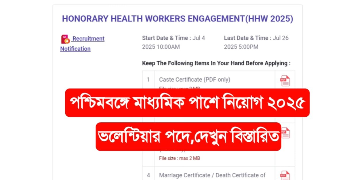 পশ্চিমবঙ্গে মাধ্যমিক পাশে Honorary Health Worker (HHW) চাকরি 2025: যোগ্যতা, বেতন ও আবেদন পদ্ধতি দেখুন!