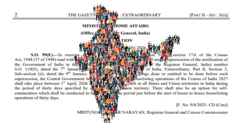 স্বাধীনতার পর ৮ম জনগণনার দিনক্ষণ ঘোষণা করল কেন্দ্রীয় সরকার। গতকাল বুধবার এই সংক্রান্ত বিজ্ঞপ্তি জারি করেছে কেন্দ্র, আগামী ২০২৭ সালে দেশজুড়ে জনগণনা হবে দুটি ধাপে। এর প্রস্তুতিপর্ব শুরু হবে চলতি বছরের ১ এপ্রিল থেকে ৩০ সেপ্টেম্বর পর্যন্ত।