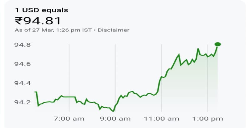 ঐতিহাসিক দরপতন ঘটেছে ভারতীয় রুপির। মার্কিন ডলারের বিপরীতে ইতিহাসের সর্বনিম্ন পর্যায়ে নেমে গেছে ভারতীয় মুদ্রার মান। আজ লেনদেনের শুরুতেই দেখা গিয়েছে, এক ডলারের বিনিময় মূল্য অতীতে সব রেকর্ড ভেঙে ৯৪.৮৩ টাকার ঘরে পৌঁছে গিয়েছে। মূলত আন্তর্জাতিক বাজারে তেলের দাম বৃদ্ধি এবং বিশ্ব অর্থনীতির অস্থিরতার কারণেই টাকার এই রেকর্ড পতন।