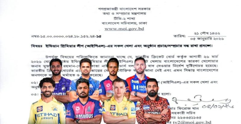 ৫ জানুয়ারি বাংলাদেশের ইউনূস সরকারের তথ্য ও সম্প্রচার মন্ত্রকের জারি করা বিজ্ঞপ্তিতে বলা হয়েছে, বাংলাদেশের ভিতরে ইন্ডিয়ান প্রিমিয়ার লিগ (IPL)-এর সব ধরনের সম্প্রচার ও টেলিকাস্ট অনির্দিষ্টকালের জন্য বন্ধ করতে হবে। এই সিদ্ধান্তটি নেওয়া হয়েছে কেবলমাত্র কলকাতা নাইট রাইডার্স (KKR) দল থেকে তাদের বাংলাদেশি ক্রিকেটার মুস্তাফিজুর রহমানকে বাদ দেওয়ার ঘটনা-এর পরিপ্রেক্ষিতে নিয়েছে বলে জানায়। বিজ্ঞপ্তি আরও বলেন এমন সিদ্ধান্ত বাংলাদেশের জনগণকে ব্যথিত, মর্মাহত ও ক্ষুব্ধ করেছে।