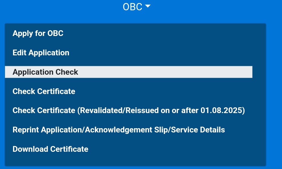 ২) পরবর্তী পেজে OBC তে ক্লিক করে Application Check এ ক্লিক করুন।