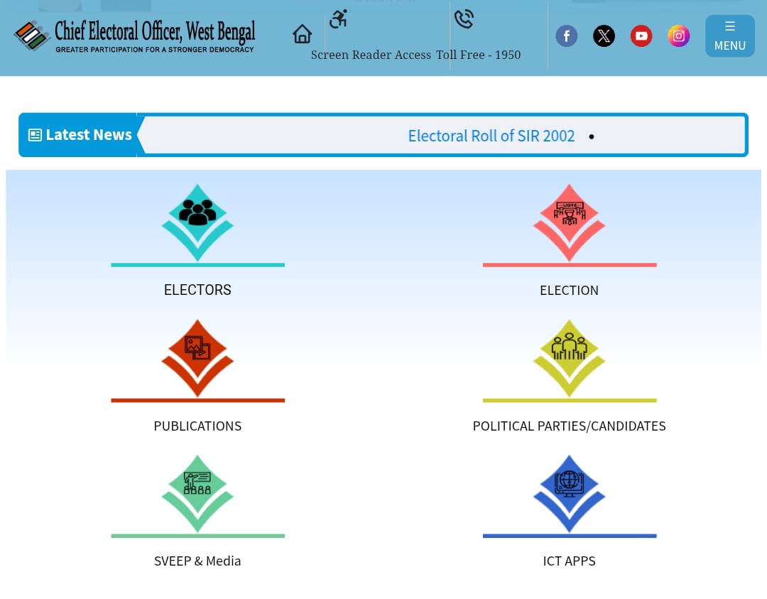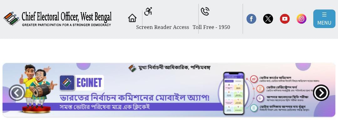১) প্রথমে আপনাকে মুখ্য নির্বাচন আধিকারিক, পশ্চিমবঙ্গের অফিসিয়াল ওয়েবসাইটে আসতে হবে। নিচের লিংকে ক্লিক করে সরাসরি অফিসিয়াল পোর্টালে আসতে পারবেন।