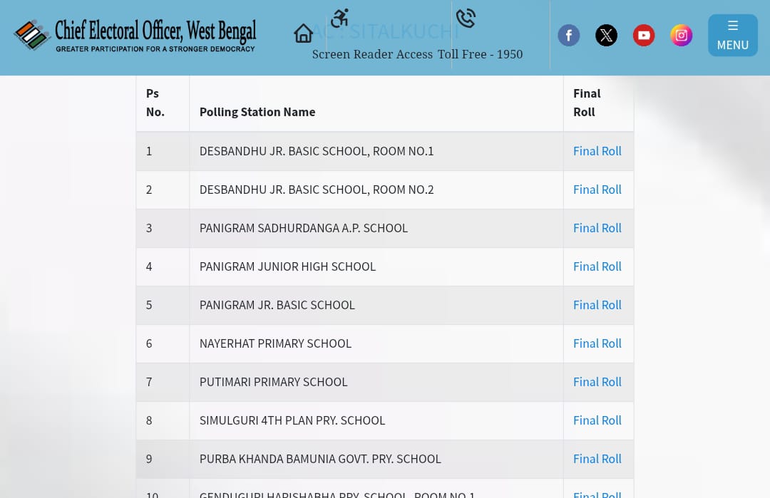 ৫) এরপর ফাইনালি আপনার সামনে বিধানসভার অন্তর্গত সমস্ত ভোট গ্রহণ কেন্দ্র চলে আসবে। এখন খুঁজে নিন কোন কেন্দ্রে আপনি কিংবা আপনার পিতামাতা ভোট দিয়েছে।