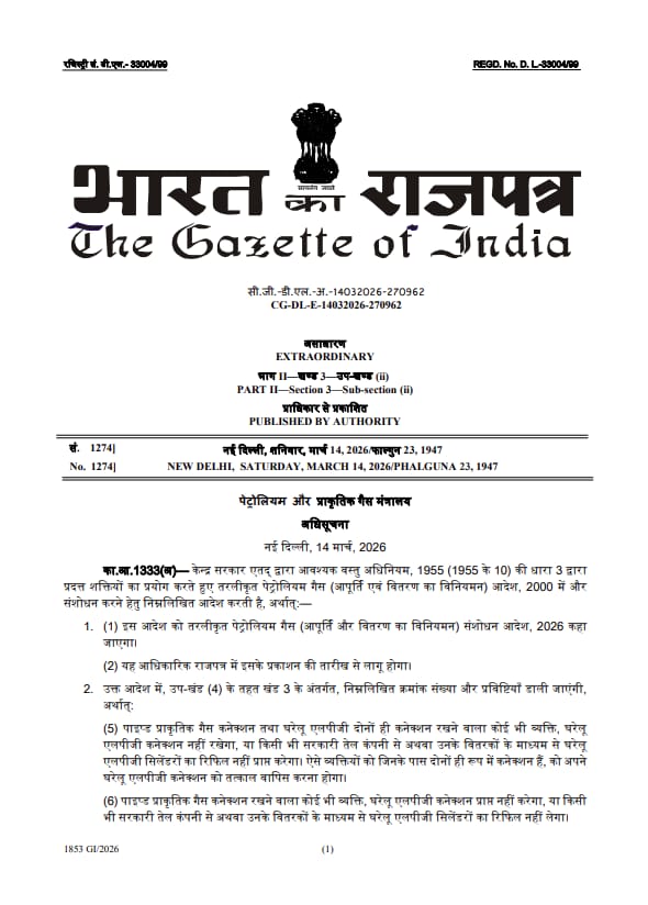 মন্ত্রকের তরফে বলা হয়েছে, যেসব বাড়িতে পাইপলাইনের গ্যাস (PNG) রয়েছে, তারা আর এলপিজি (LPG) সিলিন্ডার ব্যবহার করতে পারবেন না। এদিন প্রকাশিত গেজেটে জানানো হয়েছে, পিএনজি গ্রাহকদের কাছে যে এলপিজি সিলিন্ডারটি আছে তা অবিলম্বে গ্যাস অফিসে জমা দিতে হবে এবং তারা আর কোনো রিফিল বা নতুন সিলিন্ডার পাবেন না। এমনকি ইন্ডিয়ান অয়েল, এইচপি বা ভারত গ্যাসের মতো কোম্পানিগুলোকে এই গ্রাহকদের নতুন করে গ্যাস দিতে কড়াভাবে নিষেধ করেছে।