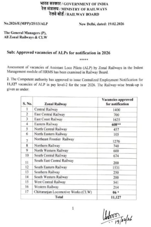 - মোট শূন্যপদ: ১১,১২৭টি সহকারী লোকো পাইলট (ALP)