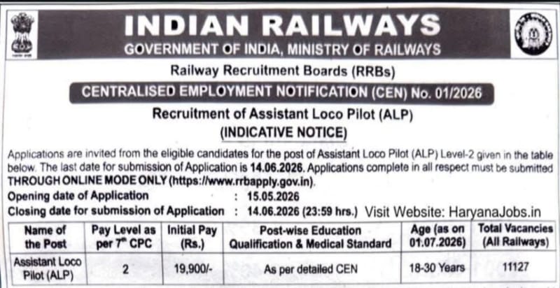 রাজ্যে বিধানসভা নির্বাচনের কাউন্টডাউন শুরু! গতকালই নির্বাচন কমিশন বাংলায় ভোটের দিনক্ষণ ঘোষণা করেছে। আর ভোটের এই আবহেই ভারতীয় রেল নিয়ে এল চাকরি প্রার্থীদের জন্য নিয়োগ বিজ্ঞপ্তি। রেলওয়ে রিক্রুটমেন্ট বোর্ডের (RRB) পক্ষ থেকে ১১,১২৭টি শূন্যপদে সহকারী লোকো পাইলট (Assistant Loco Pilot – ALP) নিয়োগের প্রাথমিক বিজ্ঞপ্তি প্রকাশ করা হয়েছে। শিলিগুড়ি, মালদা ও কলকাতা সহ সারা দেশের বিভিন্ন জোনে এই নিয়োগ দেবে।