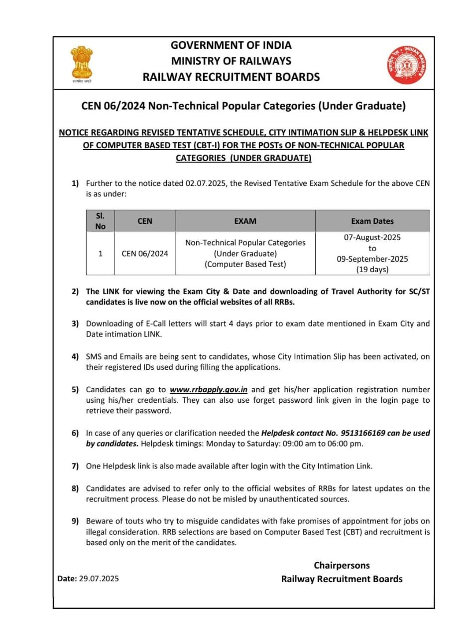 আগামী ৭ আগস্ট থেকে ৯ সেপ্টেম্বর পর্যন্ত রেলওয়ে রিক্রুটমেন্ট বোর্ড RRB UG নিয়োগের পরীক্ষাটির আয়োজন করবে এবং পরীক্ষাটি ১৯ দিনে সম্পন্ন হবে।