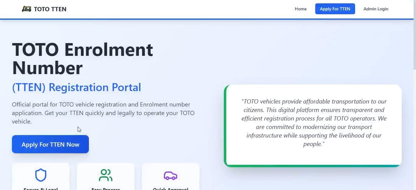 রাজ্যের প্রতিটি টোটো/ই-রিকশা অনলাইন রেজিষ্ট্রেশন (TTEN Registration Portal) বাধ্যতামূলক। মাননীয়া মুখ্যমন্ত্রী মমতা বন্দ্যোপাধ্যায় উদ্যোগে পশ্চিমবঙ্গ জুড়ে সমস্ত টোটোর রেজিস্ট্রেশন পদ্ধতি চালু হলো আজ থেকে। আর এরজন্য নতুন একটি পোর্টাল TOTO Enrollment Number (TTEN Registration) পোর্টাল চালু করা হয়েছে।