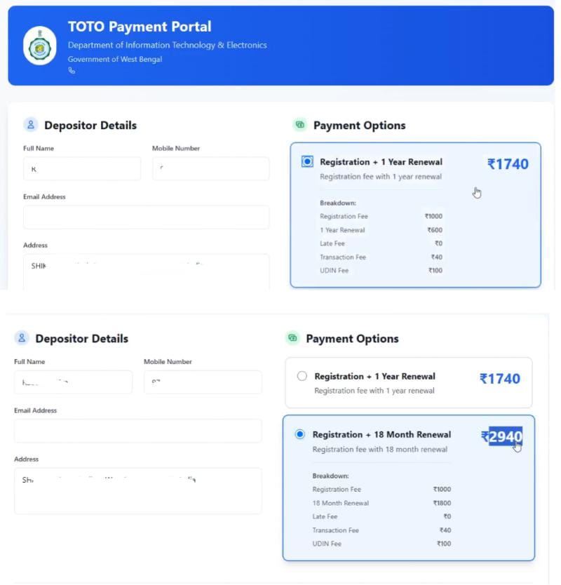 টোটো চালকদের রেজিস্ট্রেশন ও ১ বছরের রিনুয়্যাল ফি মোট ১৭৪০ টাকা অনলাইন পেমেন্ট করতে হবে। এছাড়াও রেজিস্ট্রেশন ও ১৮ মাসের রিনু্য়্যাল ফি সহ মোট ২৯৪০ টাকা অনলাইন পেমেন্ট করতে হবে। চালকেরা ১৭৪০ টাকা কিংবা ২৯৪০ টাকা অনলাইন পেমেন্ট করতে পারবেন, রেজিস্ট্রেশন করার সময়।