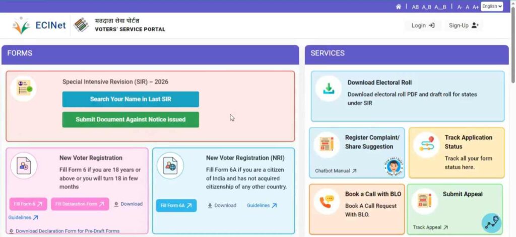 ২) এরপর ভোটার সার্ভিস পোর্টালে রেজিস্ট্রার মোবাইল উল্লেখ করে লগইন করুন। আর নতুন হলে Sign Up এ ক্লিক করে মোবাইল নম্বর, নাম ও OTP ভেরিফাই করে রেজিস্ট্রেশন করুন ও লগইন করুন।