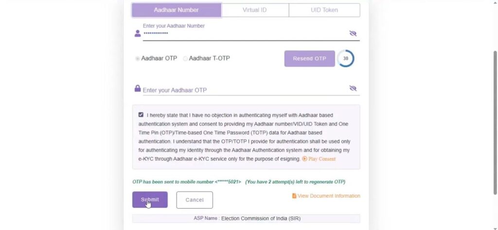 ৬) পরবর্তী পেজে আধার অথেনটিকেশন সম্পন্ন করুন। ভোটারের আধার কার্ড নম্বর উল্লেখ করুন GET OTP তে ক্লিক করুন। আধার কার্ডে যুক্ত মোবাইল নম্বরে OTP আসবে তা উল্লেখ করে সাবমিট করলেই আবেদন হয়ে যাবে। আবেদন হয়ে গেলে Acknowledgement of Appeal submitted রিসিভ কপি পেয়ে যাবেন। এরপর ডকুমেন্টস সহকারে রিসিভ কপি জমা করুন নিকটবর্তী BDO/SDO/DM অফিসে।