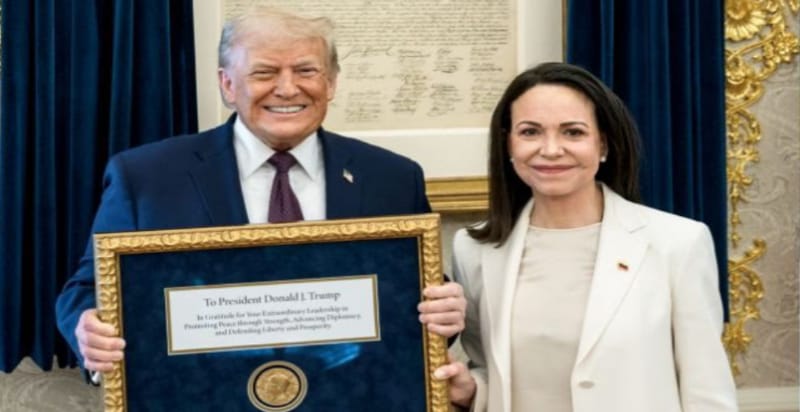সম্প্রতি বৃহস্পতিবার ভেনেজুয়েলার বিরোধী নেতা মারিয়া কোরিনা মাচাদো হোয়াইট হাউসে গিয়ে নিজের নোবেল শান্তি পুরস্কারের পদক ট্রাম্পের হাতে তুলে দেন। দুই নেতার প্রথম সরাসরি সাক্ষাতেই এই ঘটনা ঘটে যায়। এরই মধ্যে বিভিন্ন সংবাদমাধ্যমে বিষয়টি প্রকাশ্যে এসেছে।