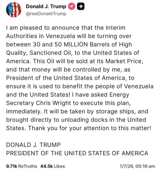 জানা গিয়েছে মার্কিন প্রেসিডেন্ট ট্রাম্পের মঙ্গলবার ট্রুথ সোশ্যালের এক পোস্টে তিনি উল্লেখ করেন, ভেনেজুয়েলা থেকে ৩ থেকে ৫ কোটি ব্যারেল তেল কিনবে আমেরিকা এবং সেই তেল আনার জন্য বিশেষ স্টোরেজ জাহাজ ব্যবহার করা হবে বলে জানিয়েছে। জাহাজে করেই তেল সরাসরি আমেরিকার বন্দরে পৌঁছে যাবে। পুরো প্রক্রিয়া দ্রুত শেষ করার নির্দেশ দিয়েছেন তিনি। এ জন্য জ্বালানিসচিব ক্রিস রাইটকে অবিলম্বে কাজ শুরু করতে বলেছেন মার্কিন প্রেসিডেন্ট। তাহলে কি ভেনেজুয়েলার প্রেসিডেন্ট নিকোলাস মাদুরোকে অপহরণ করে গ্রেপ্তারের পিছনে আদৌ কি শুধুই তেল কেনা?