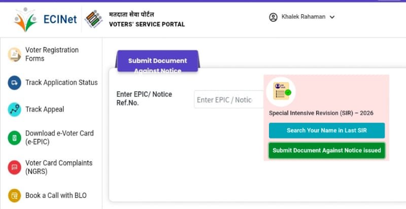 নির্বাচন কমিশনের তরফ থেকে ভোটার সার্ভিস পোর্টালে নতুন অপশন Submit Document Against Notice issued যুক্ত হলো।  এই অপশনের মাধ্যমে ভোটাররা জানতে পারবেন তাদের নামে Voter SIR হেয়ারিং নোটিশ জারি হয়েছে কিনা।  “Submit Document Against Notice Issued” এর সহজ অর্থ হলো, নির্বাচন কমিশন আপনার ভোটার হওয়ার যোগ্যতা বা তথ্যের সত্যতা নিয়ে একটি প্রশ্ন তুলেছে এবং আপনাকে আপনার দাবির স্বপক্ষে প্রমাণপত্র (Documents) জমা দিতে হবে।  যদি নোটিশ জারি হয়ে থাকে, তাহলে অনলাইনে কিংবা BLO এর মারফত নথি অনলাইন আপলোড করতে পারবেন। এছাড়াও হেয়ারিং এ গিয়ে নোটিশ দেখাতে পারবেন।
