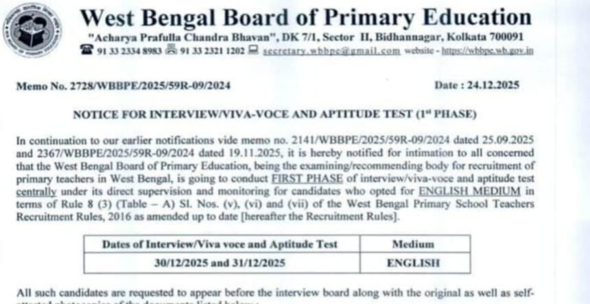 প্রাইমারি ২০২৫ শিক্ষক নিয়োগ প্রক্রিয়ায় ইন্টারভিউ পর্ব শুরু হতে চলেছে। পর্ষদ সূত্রে জানা গিয়েছে, আগামী ৩০ ও ৩১ ডিসেম্বর ইংরেজি মাধ্যমের প্রার্থীদের ইন্টারভিউ নেওয়া হবে