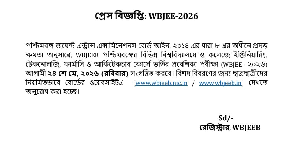 রাজ্যের বিধানসভা নির্বাচন মিটতেই পরীক্ষার মুখোমুখি হতে হবে পড়ুয়াদের। এদিন শুক্রবার পশ্চিমবঙ্গ জয়েন্ট এন্ট্রান্স এক্সামিনেশন বোর্ড (WBJEEB) ২০২৬ সালের জয়েন্ট এন্ট্রান্স পরীক্ষার পূর্ণাঙ্গ দিনক্ষণ ও সময়সূচি ঘোষণা করল। বিজ্ঞপ্তি অনুযায়ী, আগামী ১০ মার্চ, ২০২৬ (মঙ্গলবার) থেকে অনলাইনে আবেদন প্রক্রিয়া শুরু হবে, যা চলবে ৫ এপ্রিল, ২০২৬ (রবিবার) পর্যন্ত। এই সময়ের মধ্যেই পরীক্ষার্থীদের আবেদন ফি জমা দিতে হবে। এরপর যদি আবেদনপত্রে কোনো ভুলত্রুটি থাকে, তবে তা সংশোধনের জন্য ৭ এপ্রিল থেকে ৯ এপ্রিল পর্যন্ত সুযোগ দেবে। এরিমধ্যে, গতকাল শুক্রবার বোর্ডের তরফে জানানো হয়, আগামী ২৪ মে, রবিবার রাজ্যজুড়ে ইঞ্জিনিয়ারিং, আর্কিটেকচার এবং অন্যান্য পেশাদার কোর্সে ভর্তির এই প্রবেশিকা পরীক্ষা অনুষ্ঠিত হবে।
