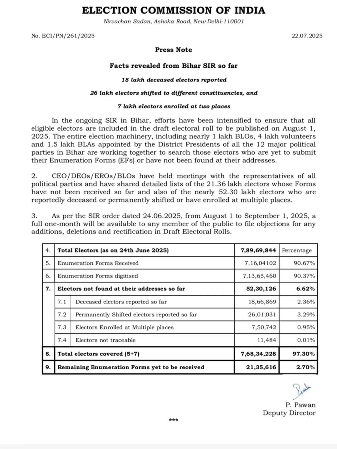 নির্বাচন কমিশনের তরফ থেকে জানিয়ে দেওয়া হয়েছে, 51 লক্ষ ভোটারের নাম বাতিল করা হয়েছে। যার কারন উল্লেখ করে জানানো হয়েছে, 18 লক্ষ মৃত ভোটারের খবর পাওয়া গেছে, 26 লক্ষ ভোটার বিভিন্ন নির্বাচনী এলাকায় স্থানান্তরিত হয়েছেন এবং দুটি স্থানে নাম নথিভূক্ত করেছেন 7 লক্ষ ভোটার।