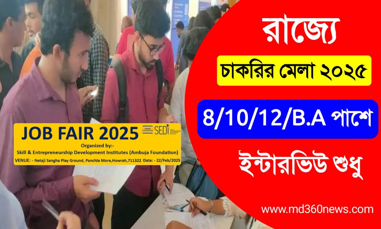 বেকার ছেলে মেয়েদের জন্য চাকরির সুবর্ণ সুযোগ। রাজ্যে শুরু হচ্ছে আবারও চাকরির মেলা (Mega Job Fair 2025)। এই চাকরির মেলায় অংশগ্রহণ করে সহজেই চাকরি পেতে পারেন আপনিও। পশ্চিমবঙ্গের যেকোনো জেলা থেকে যোগ্য প্রার্থীরা এই চাকরির মেলায় অংশগ্রহণ করতে পারবেন। শুধুমাত্র ইন্টারভিউ এর মাধ্যমে এখানে চাকরি পেতে পারেন আপনিও।