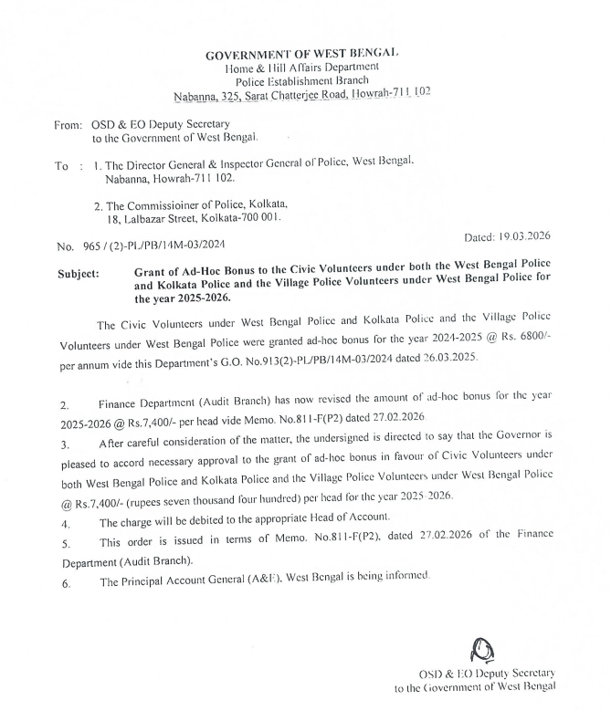 ভোটের আগে পশ্চিমবঙ্গ সরকারের পক্ষ থেকে বড় সুখবর এল রাজ্যের সিভিক ভলান্টিয়ারদের জন্য। নবান্ন থেকে জারি করা বিজ্ঞপ্তিতে জানানো হয়েছে, West Bengal Police ও Kolkata Police এ অন্তর্গত সিভিক ভলেন্টিয়ার এবং Village Police Volunteers-দের জন্য চলতি অর্থবর্ষে Ad-Hoc বোনাস বৃদ্ধি করা হলো।