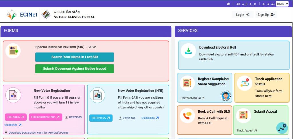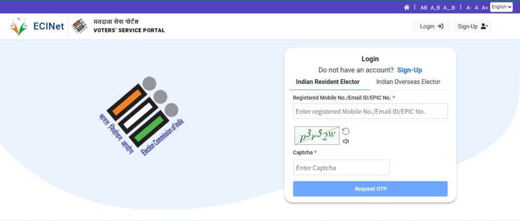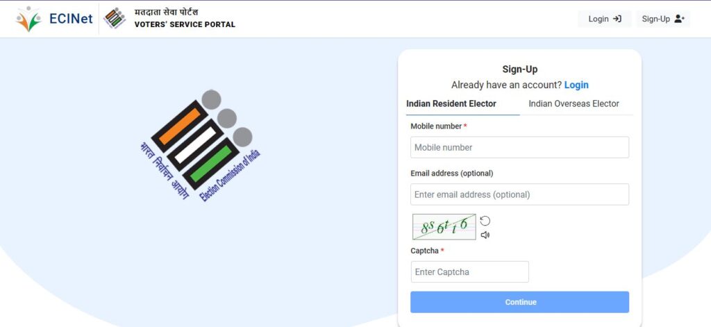 ২) আপনার যদি আগে থেকে ভোটার সার্ভিস পোর্টালে রেজিস্ট্রেশন করা থাকে, তাহলে লগইনে ক্লিক করে রেজিস্ট্রার মোবাইল নম্বর উল্লেখ OTP ভেরিফাই করে লগইন করুন। আর আপনি যদি নতুন হয়ে থাকেন, তাহলে Sign-Up এ ক্লিক করে নাম, মোবাইল নম্বর বসিয়ে দিয়ে OTP ভেরিফাই করে রেজিস্ট্রেশন সম্পন্ন করুন।