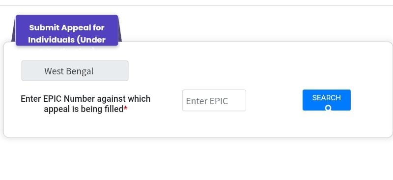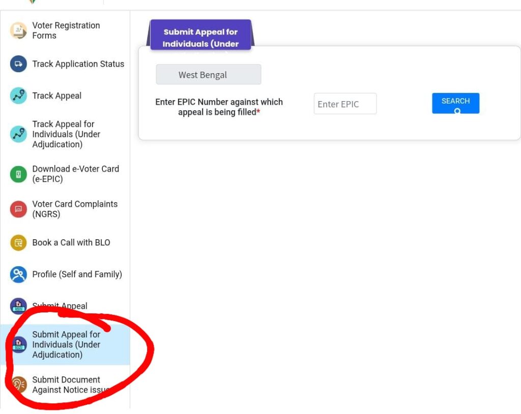 ৬ Submit Appeal for Individuals (Under Adjudication)’ অপশনে ক্লিক করলে আপনার সামনে নিচের স্ক্রিনটি ফুটে উঠবে। সেখানে নির্দিষ্ট বক্সে নিজের ভোটার আইডি বা EPIC নম্বর লিখে ‘Search’ বাটনে ক্লিক করুন। (নিচে আপনার সুবিধার্থে সেই স্ক্রিনটি দেখানো হলো)।